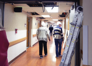The hallways already show the beginning of the work to take down the north and south wings of the old nursing home. It was quiet in the gathering space, a place that was used by residents for many of their activities throughout the day.